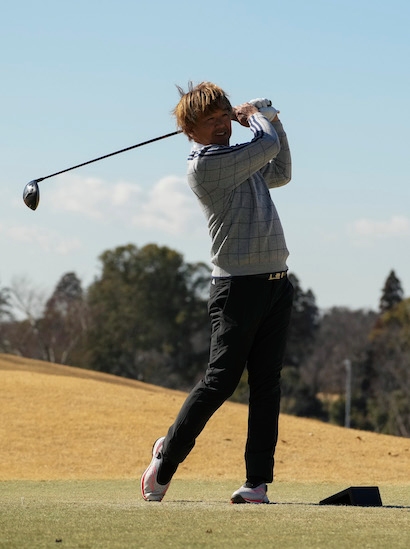 『まず、アドレスした時点で安定性とグリップ力の高さが感じられ、ダウンスイングからフォローにかけては、右足をしっかり踏み込むことができました。地面に吸い付くようなグリップ力なので、飛距離が10ヤードくらいアップしていたような気がします。歩行時は、シューズが前へ前へと足を運んでくれますね』(原監督)