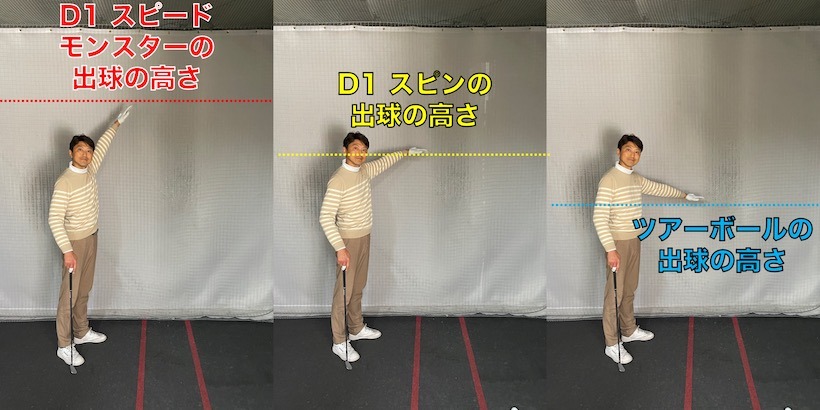 『参考としてツアーボールの出球の高さも含めた、両者の違いは下の写真のようになります。D1 スピードモンスターはけっこう高いですよね。ちょっと距離感をつかみにくい。D1 スピンもツアーボールに比べたら高めですが、許容範囲内だと思います。』(関)