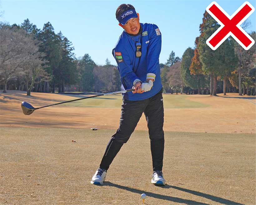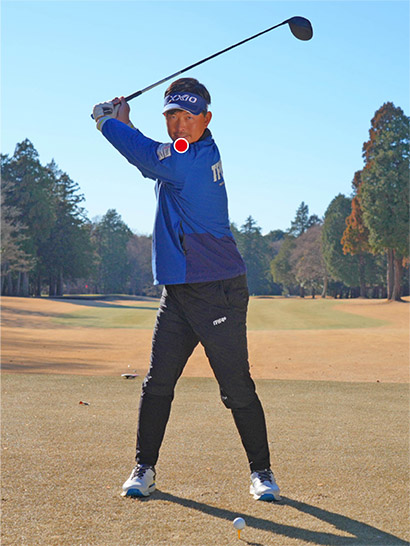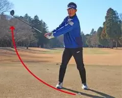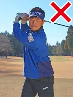 手上げのバックスイングになるとクラブヘッドの円弧が小さくなり、トップでは左肩とアゴが離れて張りのないフォームになってしまうパターンを多く見ます。