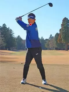 バックスイングでもう少し頑張って肩を90度、腰を45度くらい回しましょう。そしてトップでは左肩をアゴの下にタッチ。そうすればクラブを大きく上げていく感覚が生まれてカラダの深い捻転を感じられるはずです。