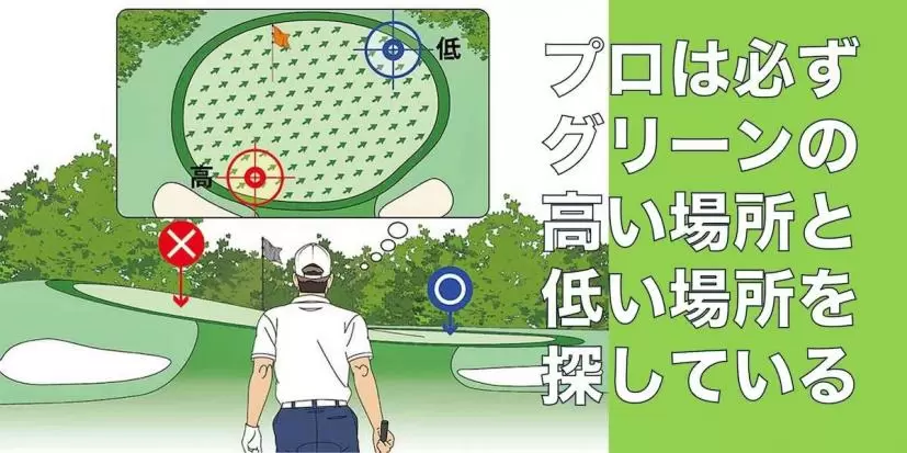 グリーンに上がる前に一番高い所と低い所を見つける!