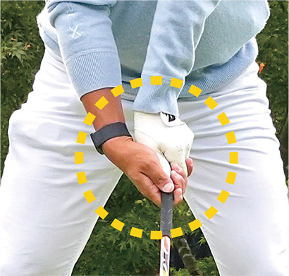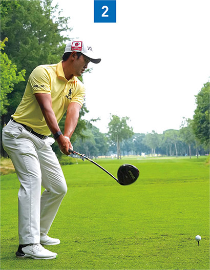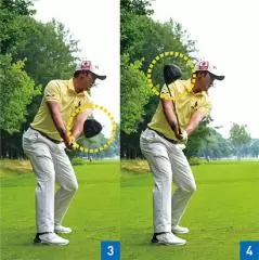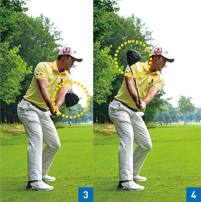 バックスイングでは左腕を伸ばしたままクラブを上げることによって体が回る。左腕を曲げてしまうと手打ちになって体が回らない。