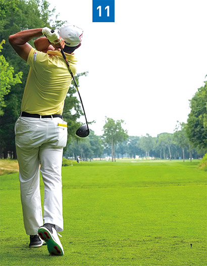 金谷選手は腕や手首はほとんど使わずに、体の動きとパワーで飛ばすタイプ。インパクト前後(写真09、10)はフェース面を変えないように金槌やトンカチで叩くような姿勢でボールを打っています。昔の選手で言えば杉原輝雄さんに似ていますが、金谷選手は見た目以上に体幹が鍛えられていて体のパワーがあるので飛距離を出すことができるのです。