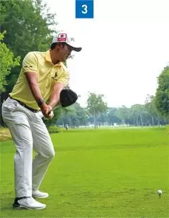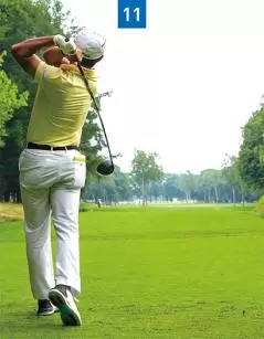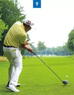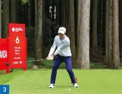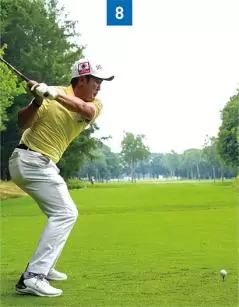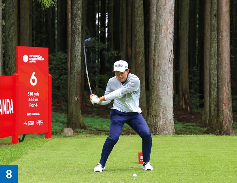 ダウンスイングではお腹に力を入れることによって、背中が少し丸くなっています(写真08)。アマチュアゴルファーの場合、お腹の力が抜けてお腹が前に出てしまう。その結果、体全体が伸び上がってしまうタイプが多いです。金谷選手はダウンスイングからインパクト、フォローまでお腹に力を入れ続けているので伸び上がる動きがありません。