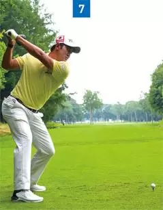 ダウンスイングでは体全体が沈みこむくらい地面を踏む。地面を踏むことによって、クラブを下ろすタイミングを遅らせることができる。(写真07)
