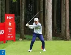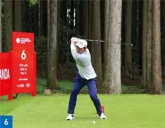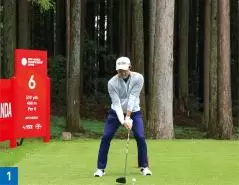 飛距離も出て、フェアウェイキープ率も高い金谷選手の特徴が一番出ているのはグリップとバックスイングです。グリップは超フックグリップ。ダスティン・ジョンソンやダニエル・バーガーに近い握り方です。バックスイングではフェースをほとんど開かずにシャットに上げています(写真03、04、05)。最近の若い選手はシャットに上げるタイプもいますが、金谷選手ほどフェースを完全に閉じたままバックスイングする選手はなかなかいません。