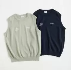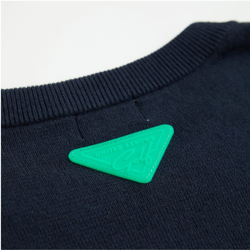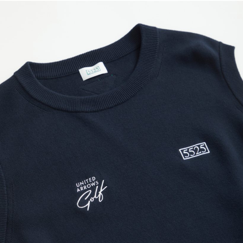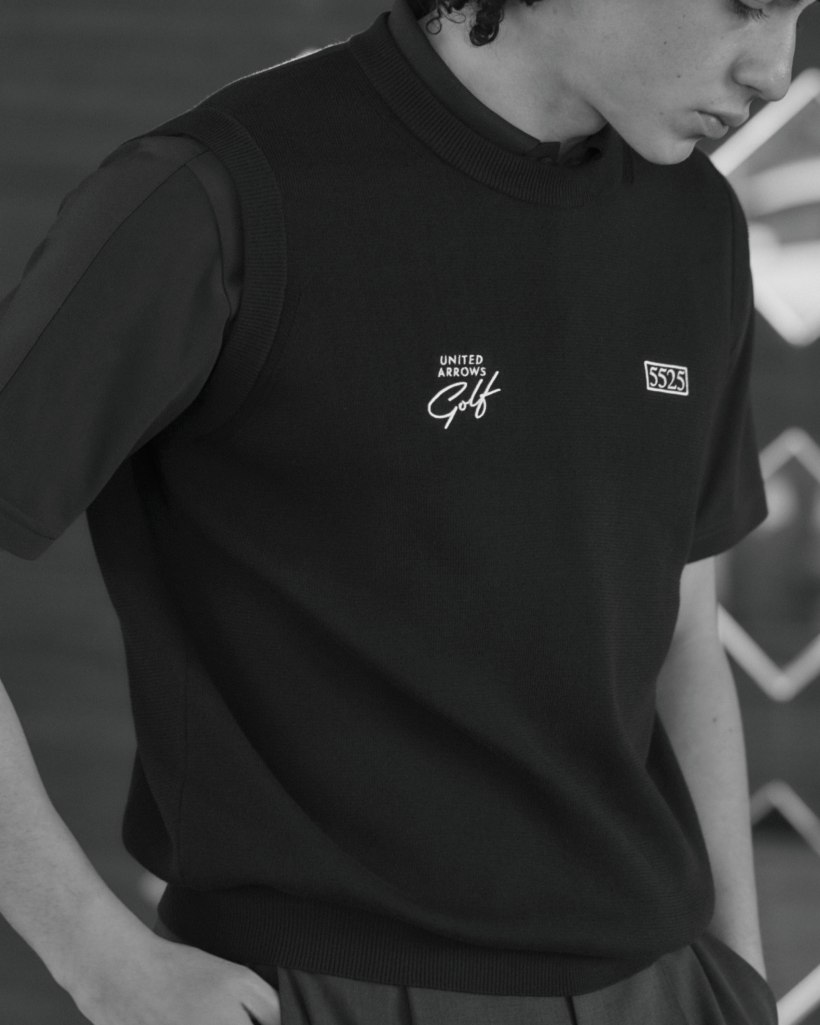 コットンポリエステル素材を使用したクルーネックのニットベスト。フロント胸部分に両ブランドロゴを配置し、背面中央上部には<ユナイテッドアローズ ゴルフ>のロゴマークを<5525>を象徴するグリーンカラーのシリコンマークに変更したデザインが特徴。