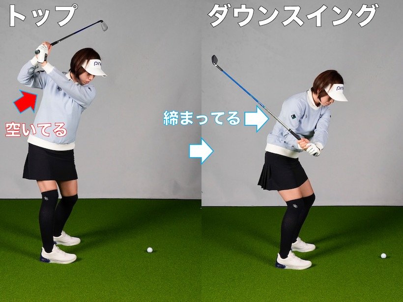 トップでクロスしてもダウンスイングで右ワキが締まり、インサイドからシャローにクラブが下りれば何の問題もありません。フレッド・カプルスや横峯さくらプロのようにですね。