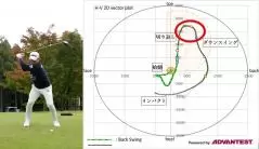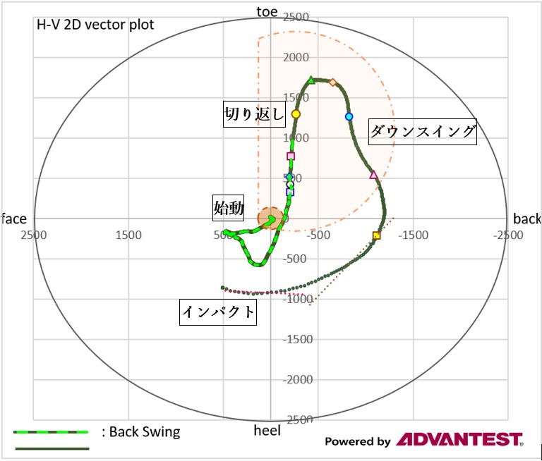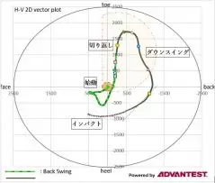 こちらは、縦軸に縦方向のしなり、横軸に横方向のしなりを表しており、スイング中にシャフトがどの方向にしなっているかがわかるグラフです。