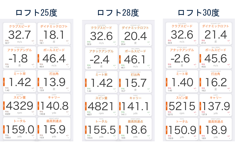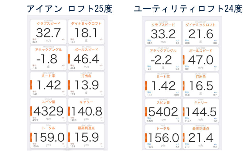 プロが打った、ロフト25度、28度、30度のアイアンの計測データを比較して欲しい。25度はTOTAL159.0ヤード、28度は155.5-ドで25度の方が飛んでいるけれど、キャリーは逆に28度の方が飛んでいる(同等と言った感じだが)。28度でもランは155.5-141.1ヤードで15.4ヤード出てしまっているから、グリーンを狙うクラブとしては飛距離は出なくても30度をチョイスしたい。参考にロフト25度のアイアンと24度のUTを同じ条件で試打したデータは次の通り。
