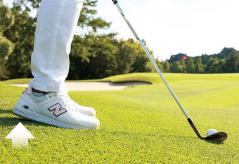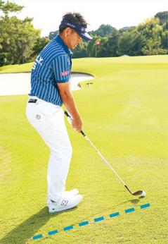 私はまず、アドレスで体とボールの距離が近くなるぶん、クラブを短く握ります。そして、両足の母趾球に体重をしっかり乗せ、前後のバランスを整えます。傾斜なりに構えるとカカト体重になってしまい、クラブがボールに届かなくなるので注意しましょう。
