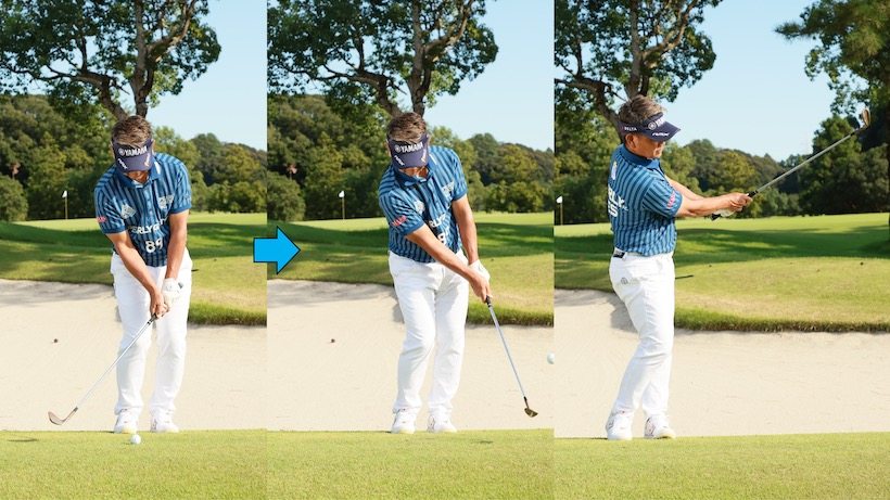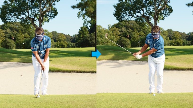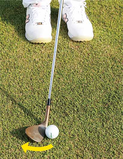 また、低い位置にあるボールをすくい上げようとして、クラブを下から入れたり、インサイドから振り下ろしたりすると、ボールの手前の地面を叩いてしまいます。