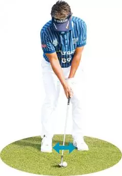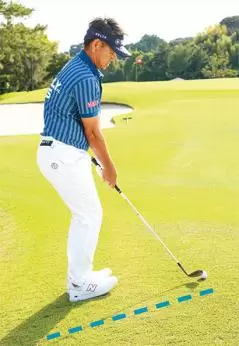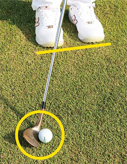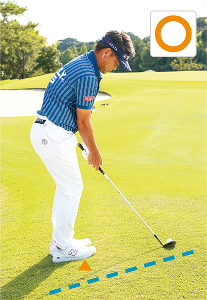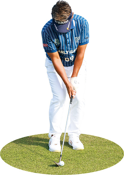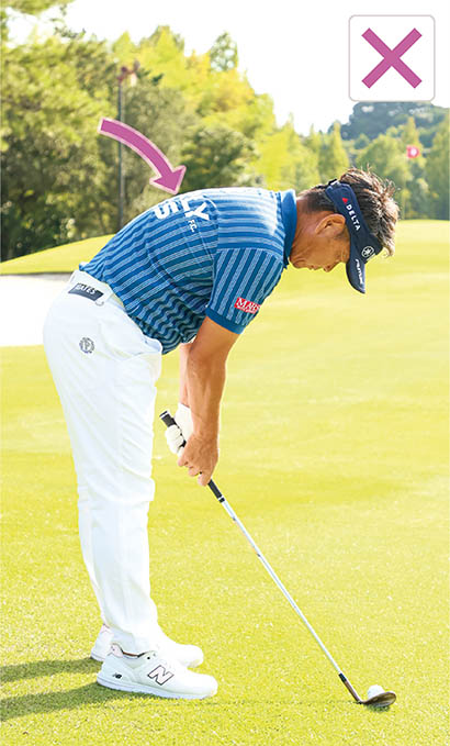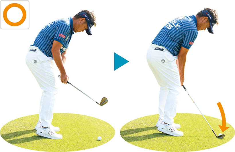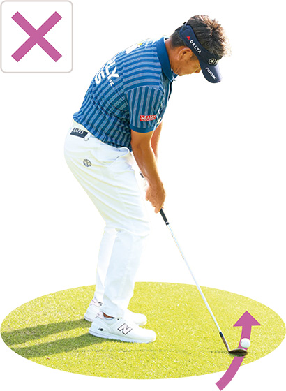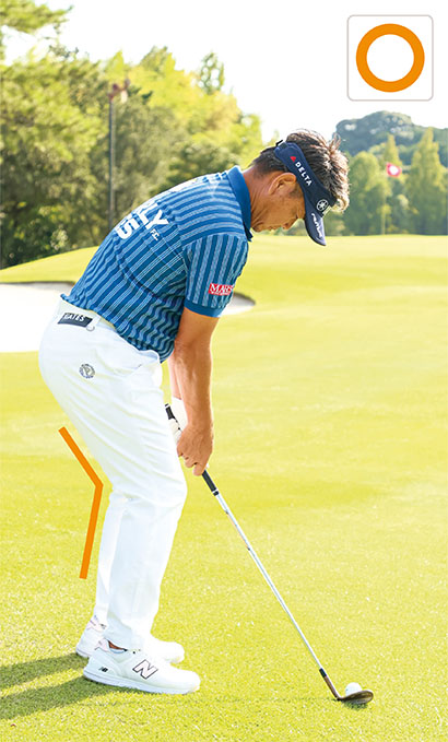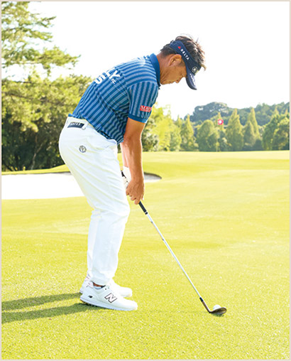 ボールが足もとより低い位置にあるぶん、アドレスでヒザをしっかり曲げることが鉄則。母趾球だけでなく、足の裏全体で前後のバランスを整えながら、ヒザの角度と前傾姿勢でボールとの距離を調節しましょう。ヒザを曲げずに前傾姿勢を深くして構えるのはNGです。