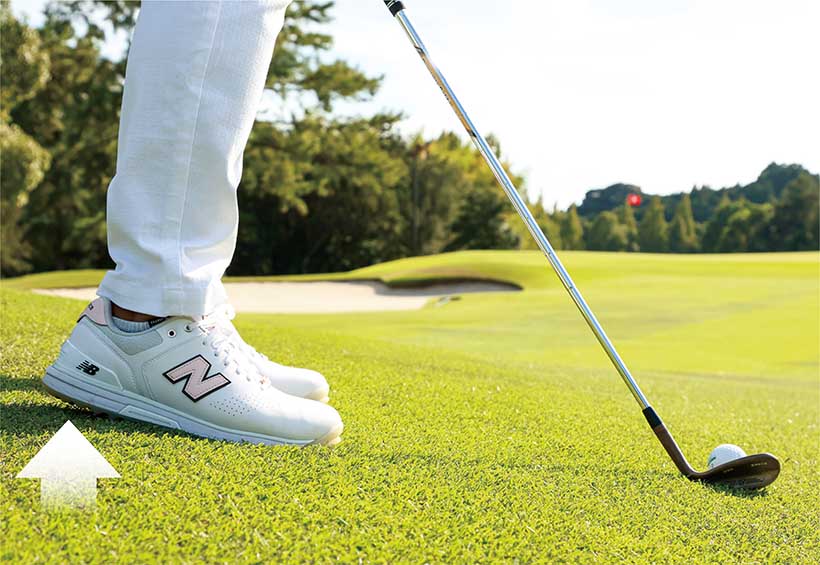 【ツマ先下がりの傾斜】右足カカトを浮かしてミスヒットを防ぐ!