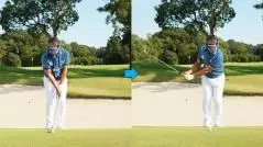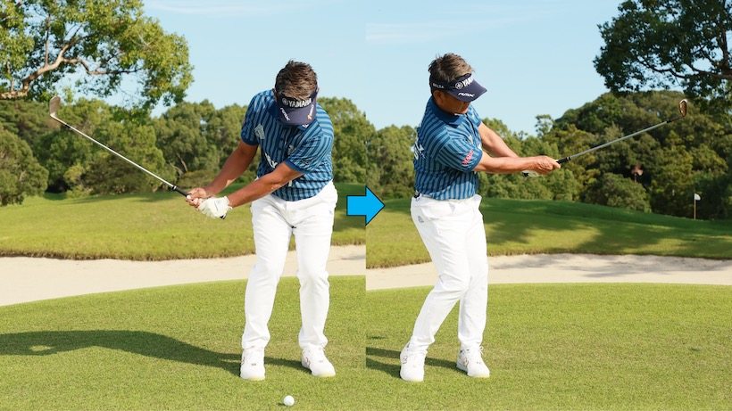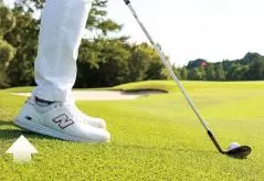 このミスを防ぐには、アドレスで右足カカトをほんの少し浮かせてみてください。右足カカトを上げることで、クラブが上から入りやすくなり、過度なインサイド・アウト軌道を修正できます。