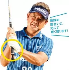 私はまず、アドレスで体とボールの距離が近くなるぶん、クラブを短く握ります。そして、両足の母趾球に体重をしっかり乗せ、前後のバランスを整えます。傾斜なりに構えるとカカト体重になってしまい、クラブがボールに届かなくなるので注意しましょう。
