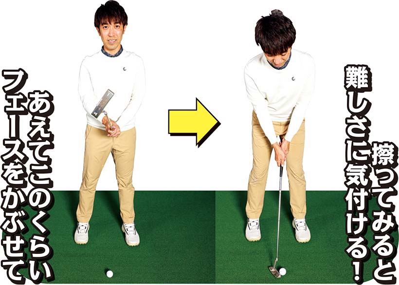 フェースを右に開いて構えてしまいがちの人は、左の写真のようにあらかじめフェースを極端にかぶせて構えます。それで真っすぐに打とうとすれば、球を擦って打たなければならない難しさに改めて気付けるし、スクエアの重要性を実感できるようになりますよ!