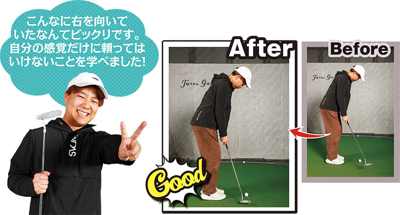 (写真左)自分の感覚頼みだとこんなに右を向いていることも……(写真右)あらかじめスティックをターゲットに向けてからアドレスを作ってみる!
