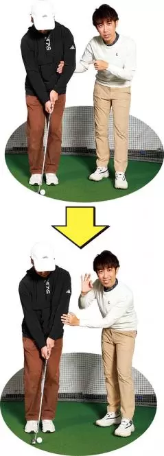 アドレスでスタンスもフェースも右を向いてしまっており、外側に上げられたクラブヘッドをインパクトで無理矢理左ヒジを引くことで球を擦りスクエアに合わせていた!