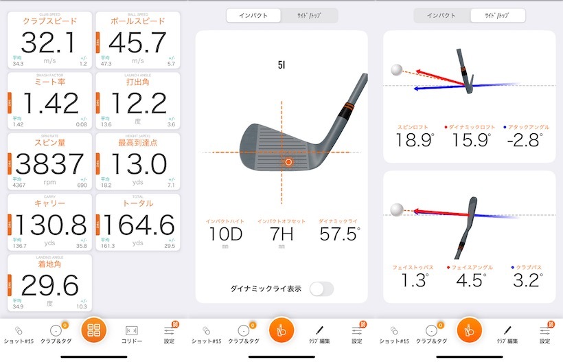 その当たり損ねたボールとは具体的にどんなものなのか。プロである高橋には再現が難しい。そこで、ロフト22度・長さ38インチでスチールシャフト(90g台)が入った5番アイアンを用意して、編集部員が打って再現してみた。練習場のマットの上で10球ほど打ったうちのひとつが、下のデータだ。
