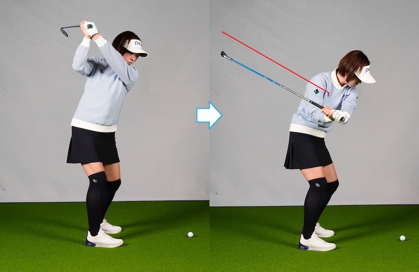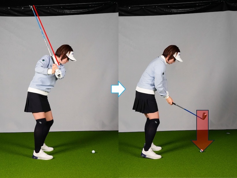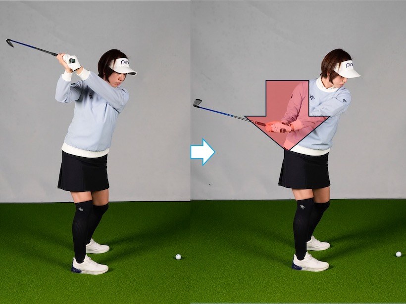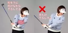 中には一生懸命シャローイングしているにもかかわらず、アーリーリリースになってダフる人もいるのではないでしょうか。そんな人のほとんどは、トップでクラブが寝た状態をキープしたまま、手を真下に落とすように動かしています。こうなると体と腕がバラバラに動き、手だけで下ろすスイングになってしまいます。手打ちになるため、今までは出なかったミスまで出るようになりかねません。