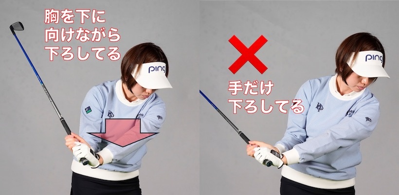 本来のシャローイングではトップの位置から前屈が入って胸が下を向きます。柔道の一本背負いや、杵を振り下ろしてお餅をつくように、胸を下げることによって手元が下がりクラブが下りてくるわけで、手でクラブを下ろしているわけではありません。