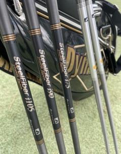 20日の練習日、選手たちが最終調整をしているドライビングレンジの後方に見慣れない色のトゥルーテンパー「Steel Fiber(スチールファイバー)」が立てかけてあるのを見つけた。プリントされている「i105」「i90」「i75」から「スチールファイバーiシリーズ」なのはわかるが、ブラックと濃いグレーのツートンカラーになっている。発売中の「iシリーズ」と何が違うのか、近くにいたツアー担当に話を聞かせてもらった。