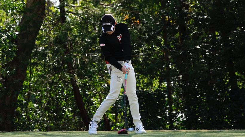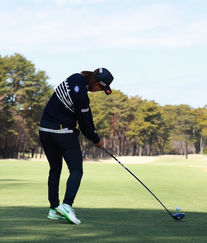 飛ぶインパクトでは腰の正面がボールより左を向いています。「腰が入る」などと言うように、インパクト時は腰が先行して回転しています。そのため飛球線後方からインパクトを見るとお尻が見えます。腰が回っているほどお尻がたくさん見えるわけです。女子プロはみんなこうなっています。