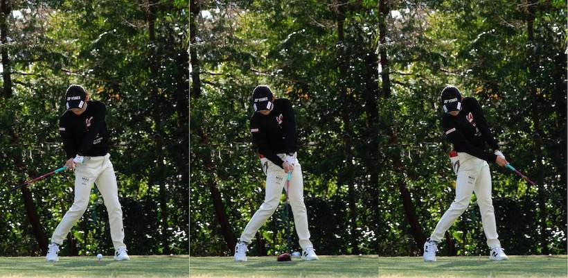 腰が先行してグリップが遅れてくると「振り遅れている」と思う人がいるかもしれません。その通りで確かに振り遅れてはいるのですが、飛ばすにはこの振り遅れ(ラグ)が欠かせません。いわば正しい振り遅れで、ラグを作ることが飛ばしの条件。正しくラグが作れると3つのポイントが自ずと揃うとも言えます。