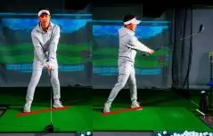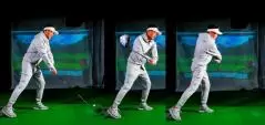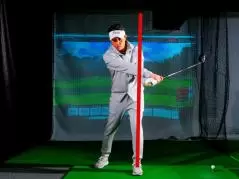 クローズにして左足の軸を確保する。軸が決まり、ヘッド返すとクラブが振れる。