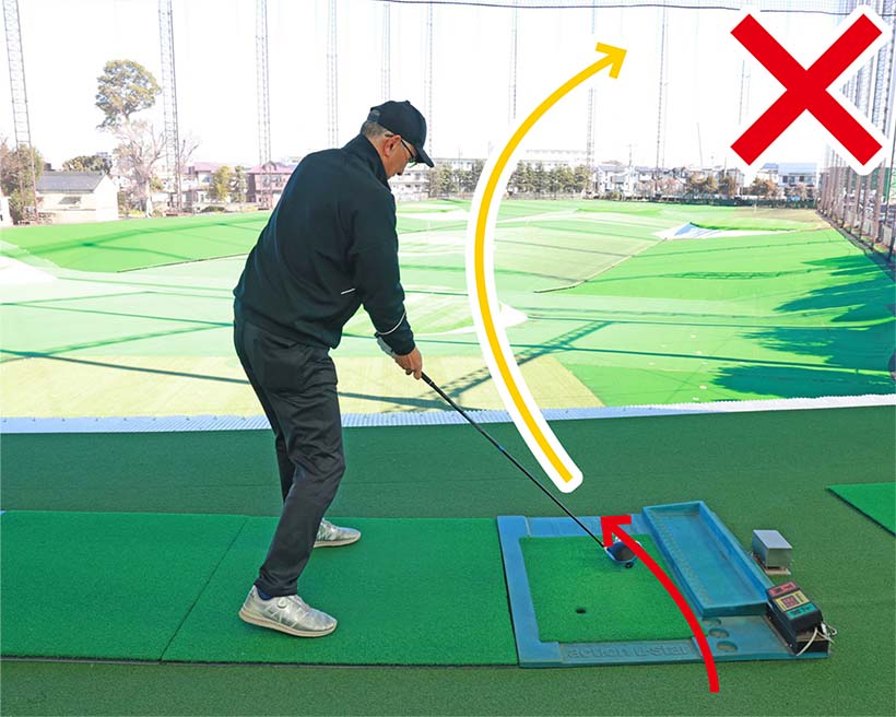 スイング軌道がアウトサイドイン。インパクトでフェースが開いて当たる。これがスライスの元凶です。