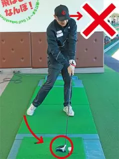 まずスイング軌道から見てみましょう。軌道よりも先にチェックしてほしいのはボールの位置です。ドライバーのボールの位置は左カカト内側の延長戦上の前が基本ですが、ボールを左に置きすぎていませんか?