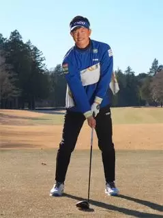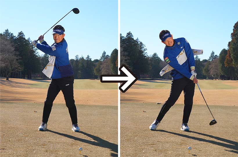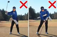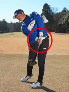 両ワキをきつく締める必要はありませんが、両ヒジを常に下に向けておくイメージが大事です。そうすれば両ワキの適度な締まり感が保たれてカラダの回転と腕の振りが連動したスイングを体感できます。