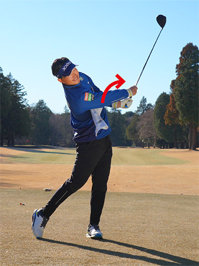 そしてグリップエンドを支点にした腕のローテーションとフェースターンがリンクすればボールのつかまりがよくなり、曲がり幅が少なく抑えられて飛距離がアップします。