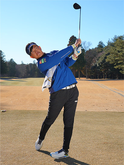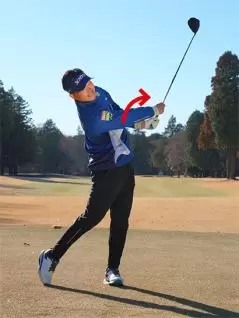 インパクトからフォロースルーにかけてグリップエンドをお腹のほうに向けたまま、胸やお腹を目標方向に向けるつもりでスイングすればカラダの回転と腕の振りがリンクしてスイング軌道が安定し、気持ちよく飛ばせるようになります。