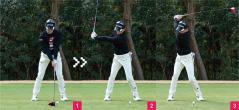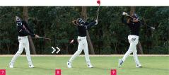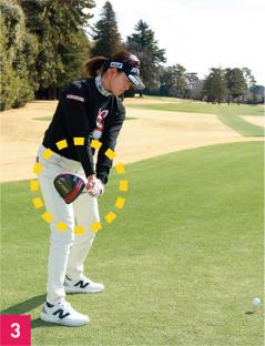 アマチュアの人に参考にしてほしいのは腰のラインです。ハーフウェイダウン付近からフォローまで(写真04、05、06)、腰のラインが地面と平行になっていて全く傾いていません。右腰が下がるとダフり、左腰が上がりすぎると伸び上がったスイングになってしまいます。岩井千怜のように腰をレベルにして、体を回すスイングができれば飛んで・曲がらないドライバーに近づきます。