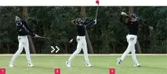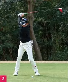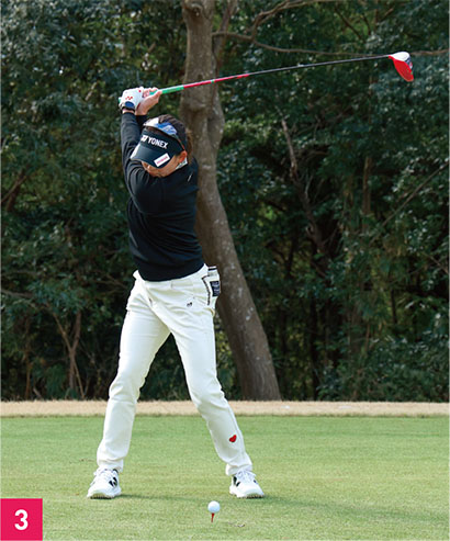 岩井選手のスイングを見ると、バックスイング(写真02、03)では一度、アドレスよりも手元を低くします。手元を低くすることでヘッドが高くなるので、自然とコッキングができます。どちらかと言えばアーリーコック系のスイングです。早めにコッキングを完成させることによってスイングプレーンから外れないコンパクトな軌道になります。