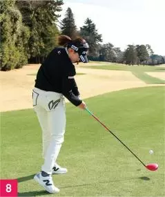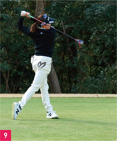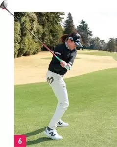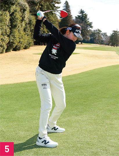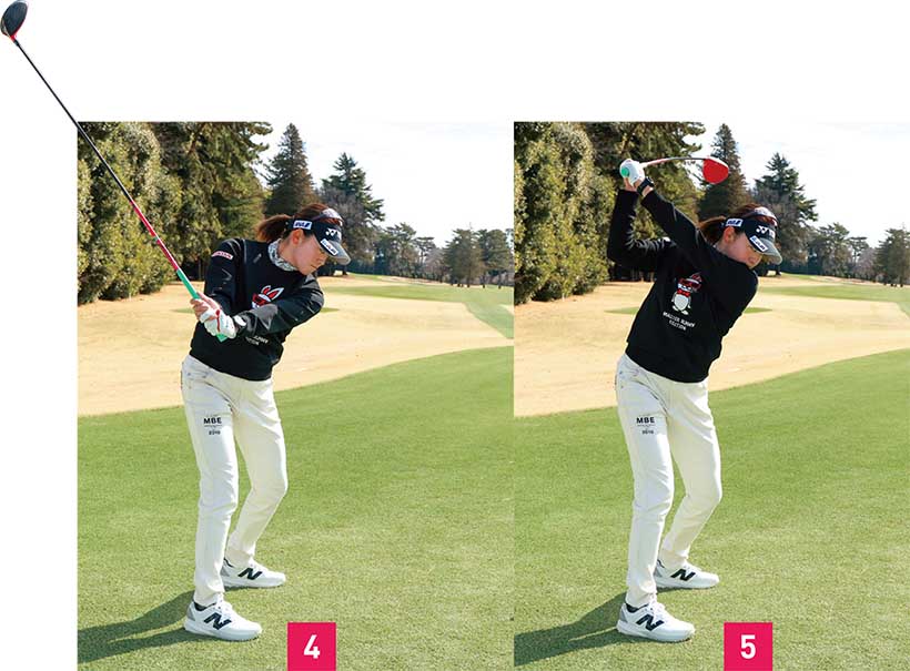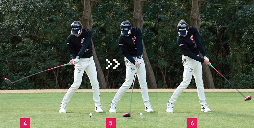 アマチュアの人に参考にしてほしいのは腰のラインです。ハーフウェイダウン付近からフォローまで(写真04、05、06)、腰のラインが地面と平行になっていて全く傾いていません。右腰が下がるとダフり、左腰が上がりすぎると伸び上がったスイングになってしまいます。岩井千怜のように腰をレベルにして、体を回すスイングができれば飛んで・曲がらないドライバーに近づきます。