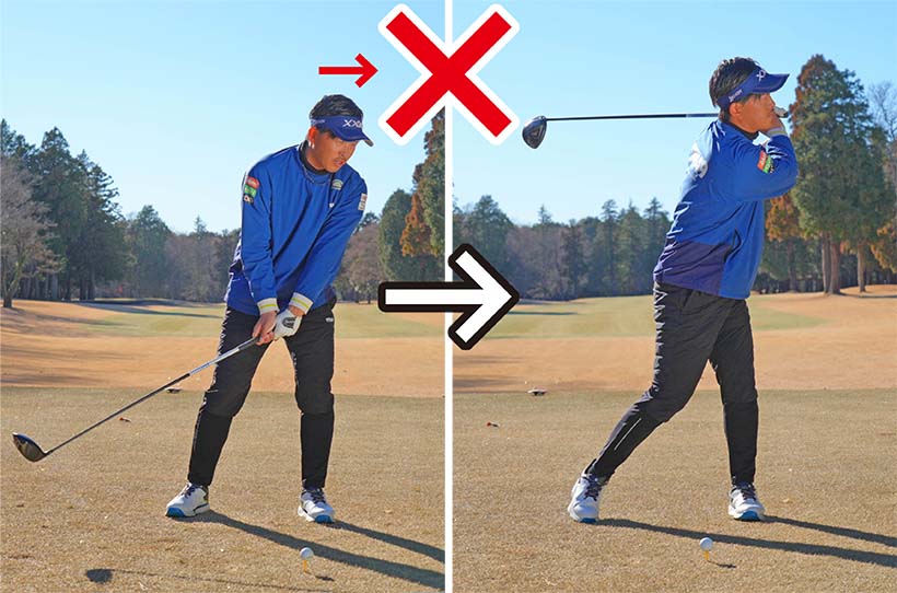 何よりもインパクトで頭がボールよりも前に出てしまうのは絶対によくありません。カラダの軸が左右にブレて回転が歪み、スイング軌道が安定しない。ミート率が低下するだけではなく、クラブヘッドの遠心力をまったく活かせない。飛ばないし、曲がり幅が大きくなってしまうからです。