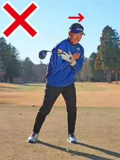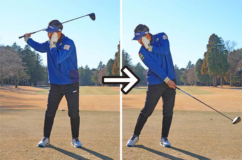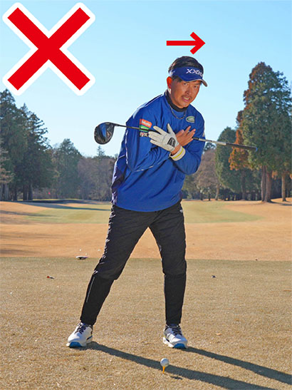 ダウンスイングからフォロースルーにかけて肩を横に回そうとすると側屈ができず、頭が目標側に流れてしまいます。
