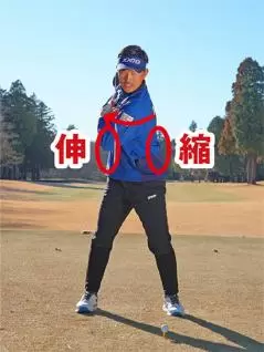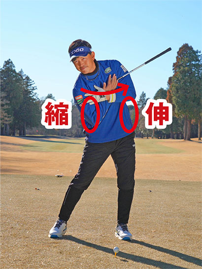 アドレスの前傾軸に対してカラダを直角に回すのですから肩は斜め回転となり、左右のワキ腹の伸縮が感じられるでしょう。バックスイングでは右ワキ腹が伸びて左ワキ腹が縮む。そしてダウンスイング以降は右ワキ腹が縮んで左ワキ腹が伸びます。