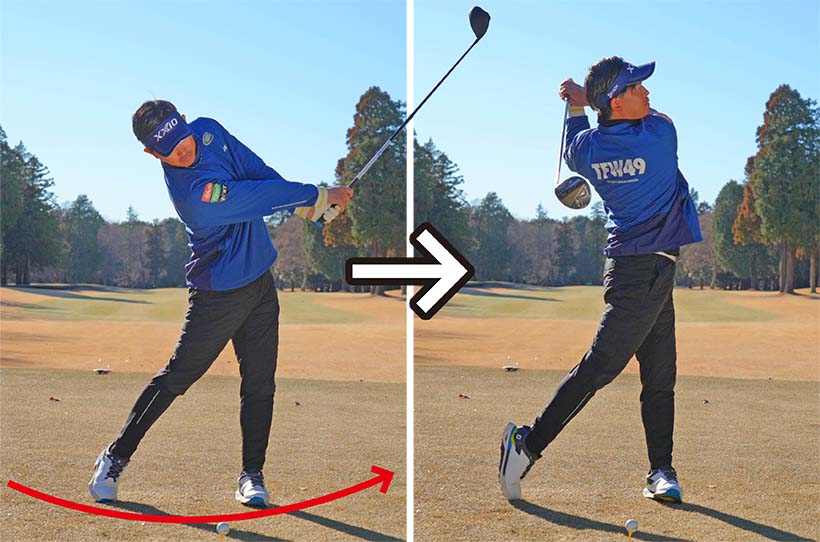 クラブをインサイドから適正の角度で振り下ろし、イン・トゥ・インの軌道でボールを打ち抜くには重心を少し右に残しておくイメージが必要です。