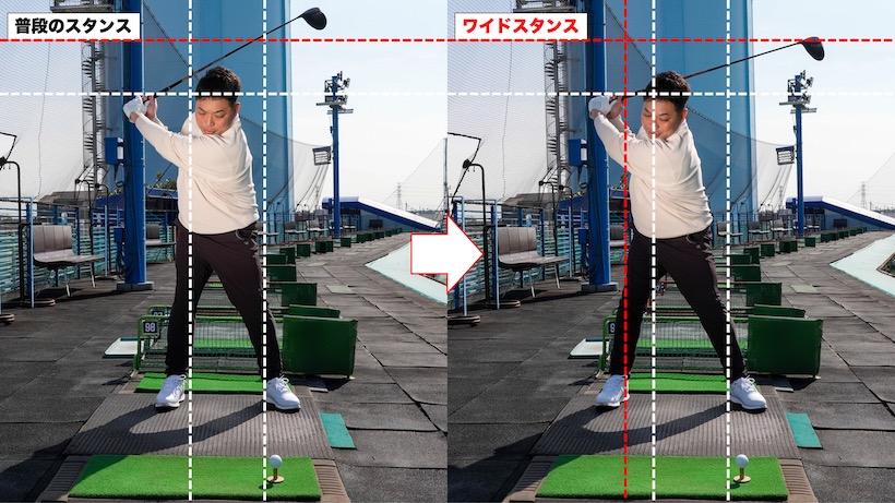 ゴルフサプリ ワイドスタンスにして素振りをしてみましたが、普段よりも体が回ります。下半身が動きにくくなった分、無意識に上半身を捻転させようとしているのでしょうか。