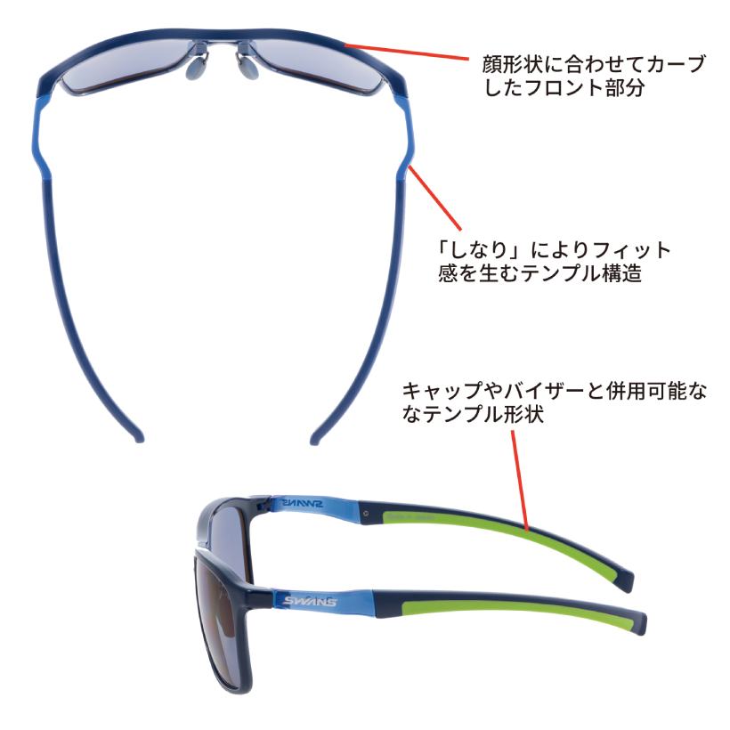 テンプルはキャップやバイザーと併用できるよう、一般的なカジュアルモデルと比較してストレートなデザインとし、素材の「しなり」を生かしてぴったりと頭部に密着してフィットする。