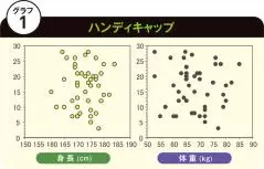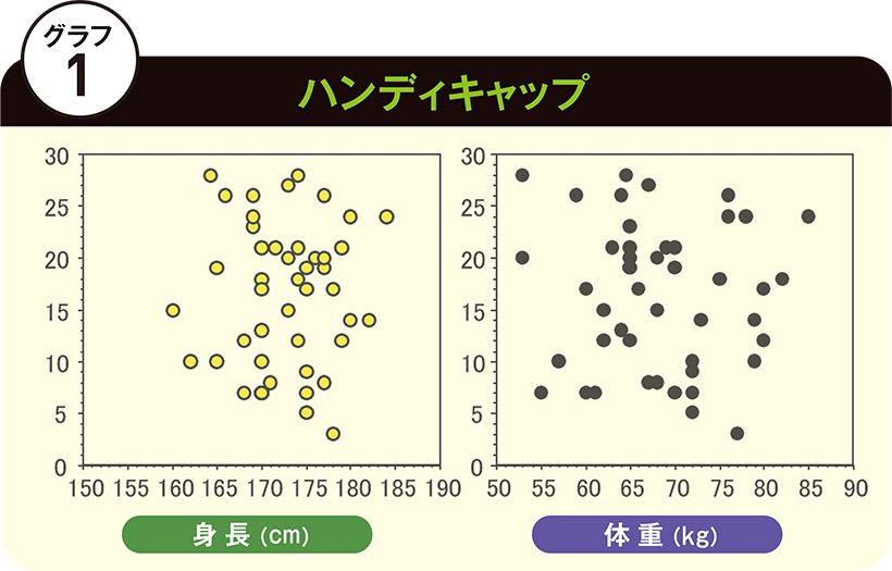 この結果を見ていただくとわかるように、みんなバラバラ。身長や体重とハンデキャップとは相関性を認めずに無関係と結論することができました。