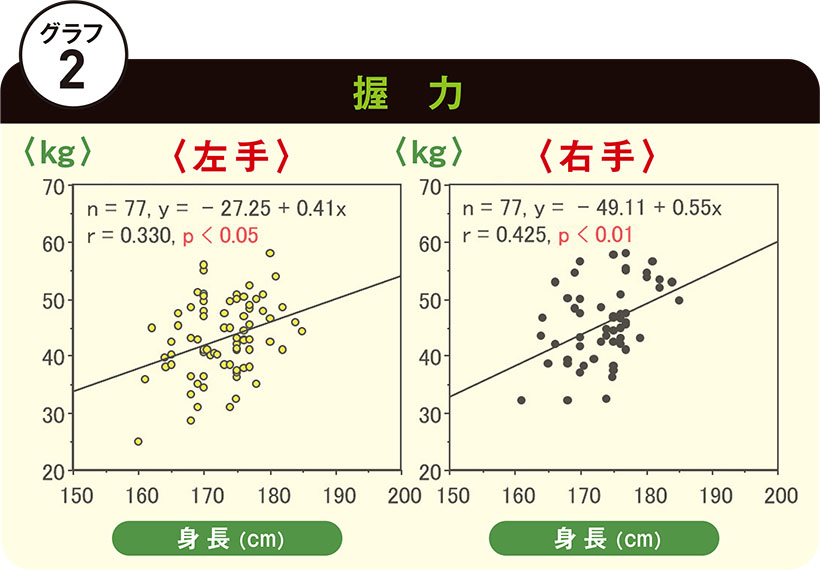 清永 はい関係ありません。では「力」について調べてみるとどうでしょう? 身長と握力についての相関性を調べてみました。それがグラフ(2)になります。対象者は先ほどと同じ77名です。