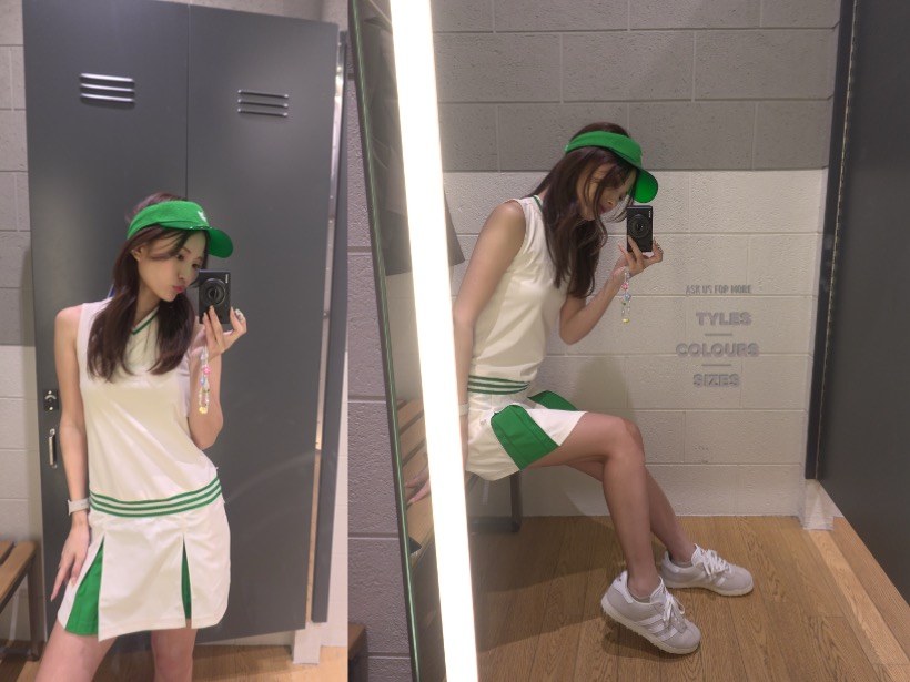 まずはこちらのシンプルなワンピース。結局ゴルファーって緑に惹かれるよね。ってことで、グリーンとホワイトのバイカラーが可愛いスタイリングに。シューズは、ガゼルの色をチョイス。