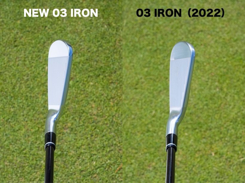 『ソールですね。抜け感は新しい「03」の方が良いです。前作のほうがターフが深くなりましたが、新しい「03」はインパクト後にスッと抜ける感じがあります。トレーリングエッジも削って、ダブルカットソールにした効果です。それから、打感は弾き系のそれなのですが、その中にやわらかさが感じられて心地良い。同じコンセプトで開発されたアイアンなのに、より洗練されたことが伝わってきます』(石井)