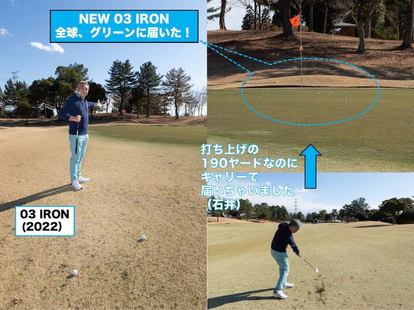 『打ち上げだから、絶対にグリーンまで届かないと思ったんですが、新しい「03」だと届いてしまいましたね(汗) 打ち上げなので、グリーンに届かせるには185ヤードは打たないといけないのですが、新しい「03」は全球ピンに絡んでしまいました。ということは、トータルで195ヤードは飛んでいることになります』(石井)