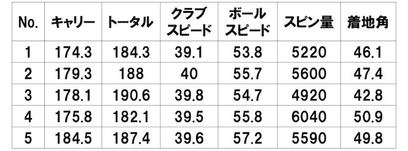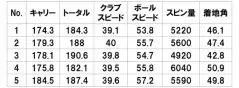 『新旧をそれぞれ5球ずつのデータを抽出しました。新しい「03」は縦距離のブレが前作に比べて少ないことがわかると思います。それから、飛距離が出るわりにバックスピンがしっかり入ります。飛ぶだけでなく、高弾道で止まる球が打てると言うことが、測定でもわかる結果になりました』(石井)